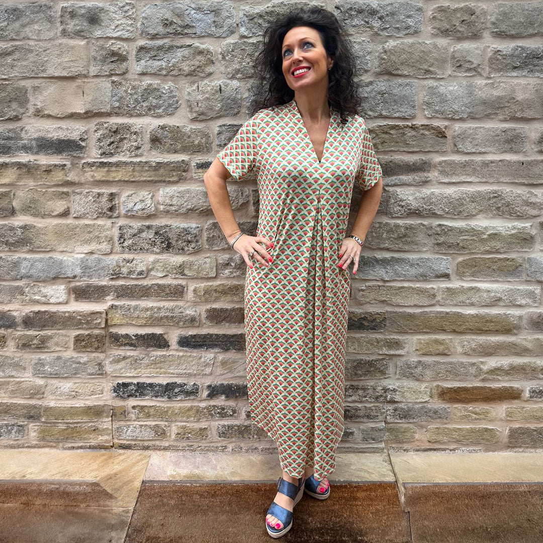 Fresh and playful, this midi dress features an eye-catching watermelon-inspired print in citrus hues. Designed with a V-neckline and short sleeves, it offers a flattering fit through the body with a fluid skirt. This easy-to-wear style is ideal for warm-weather days, from casual outings to summer gatherings. Designed and Made in Spain.